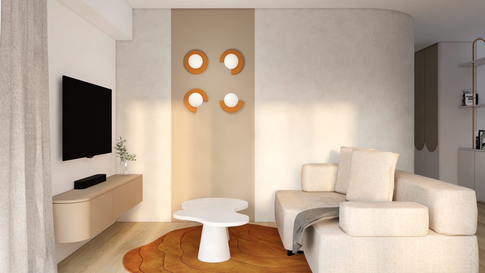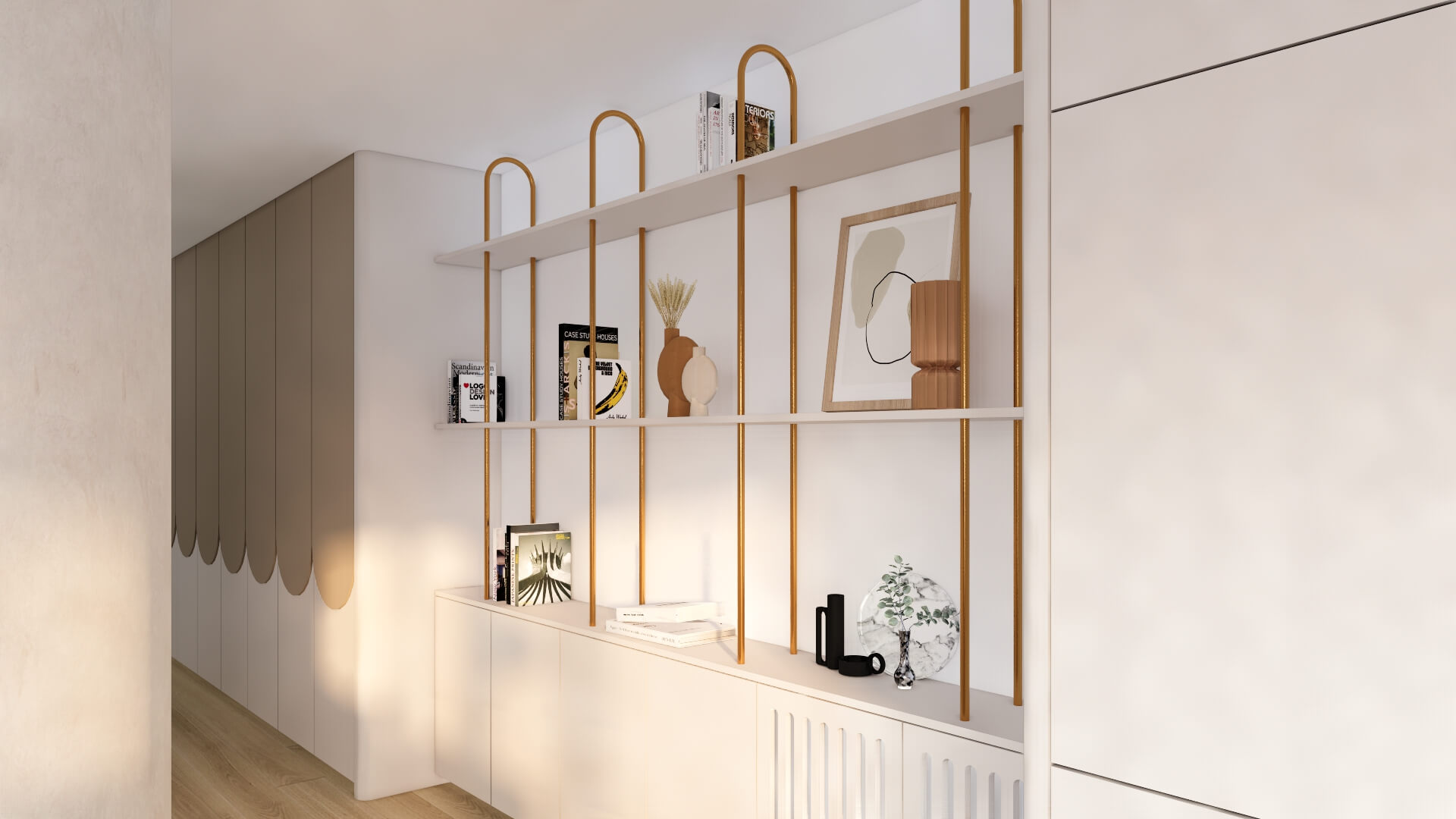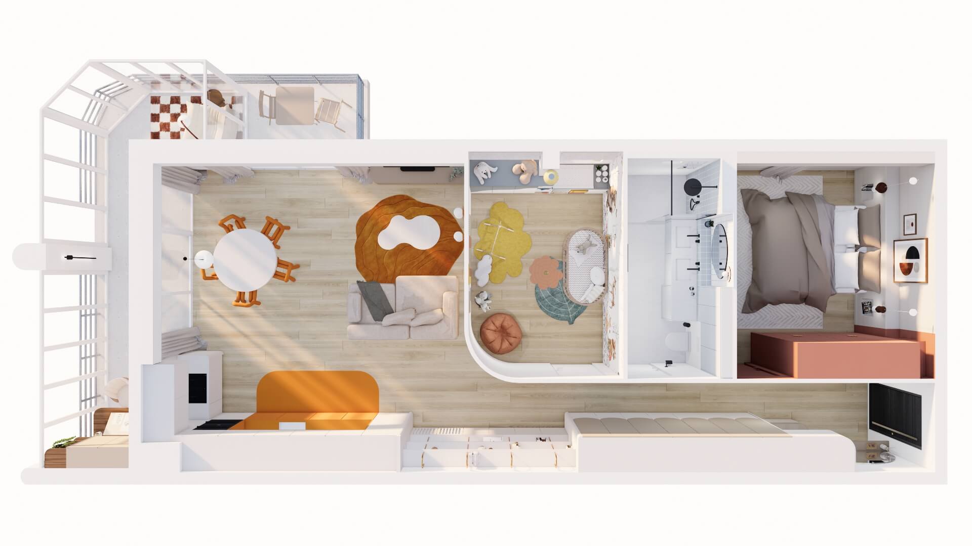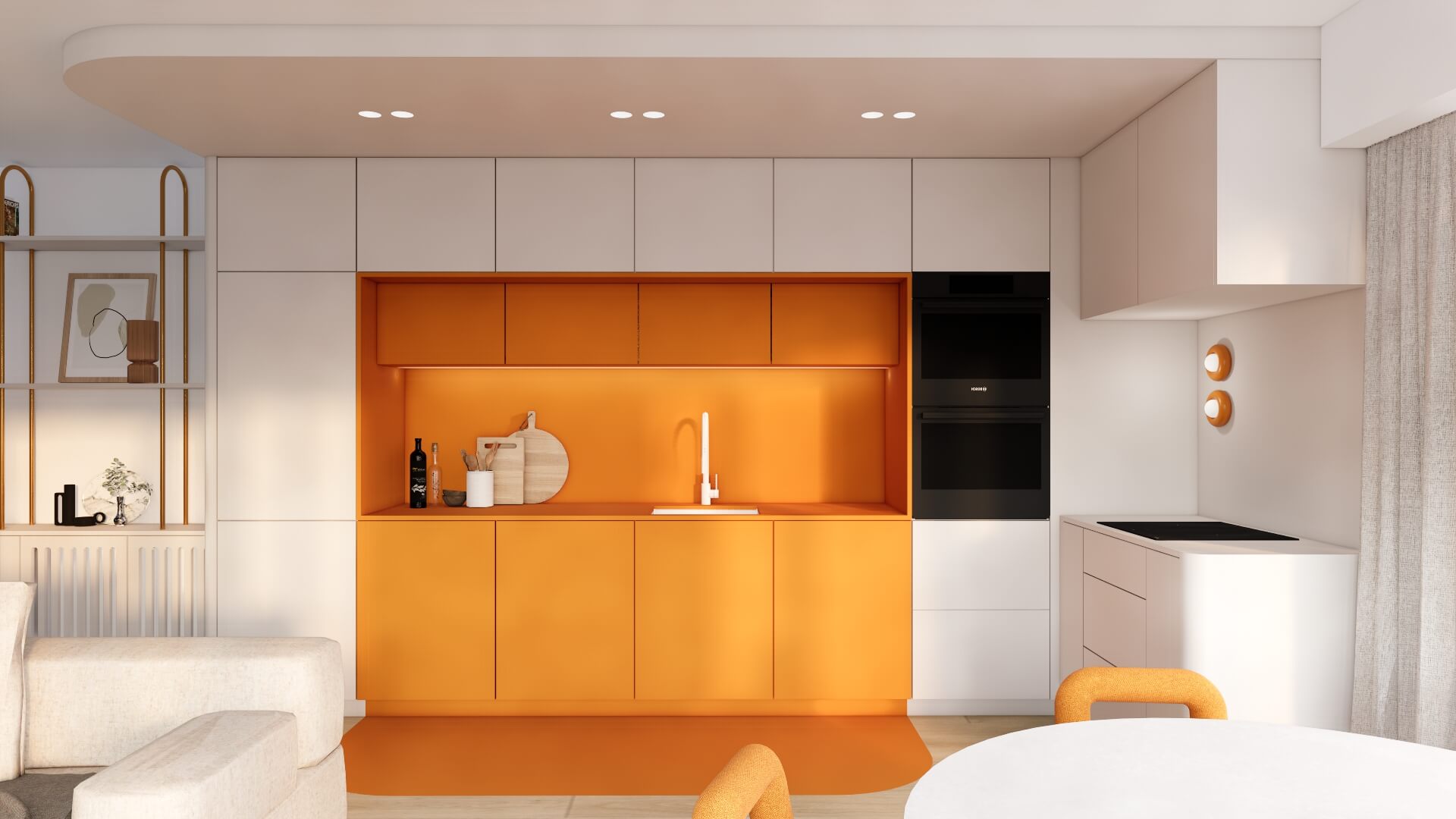 Dans un appartement 2 pièces tout en longueur de 70m² avec 11m² supplémentaires de loggia, l'objectif principal était de réagencer l'espace :